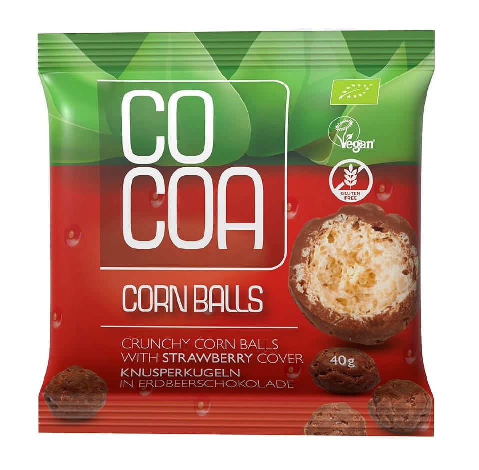 Jahodová příchuť * 65 % (kokosový květový cukr*, kakaové máslo*, mandle*, kokosové nápojové prášek*, lyofilizované jahody* 8 % – kakaová hmota min. 35 %), kukuřičné lupínky* 35 % (kukuřičná krupice*) (* Složka z kontrolovaného ekologického zemědělství)