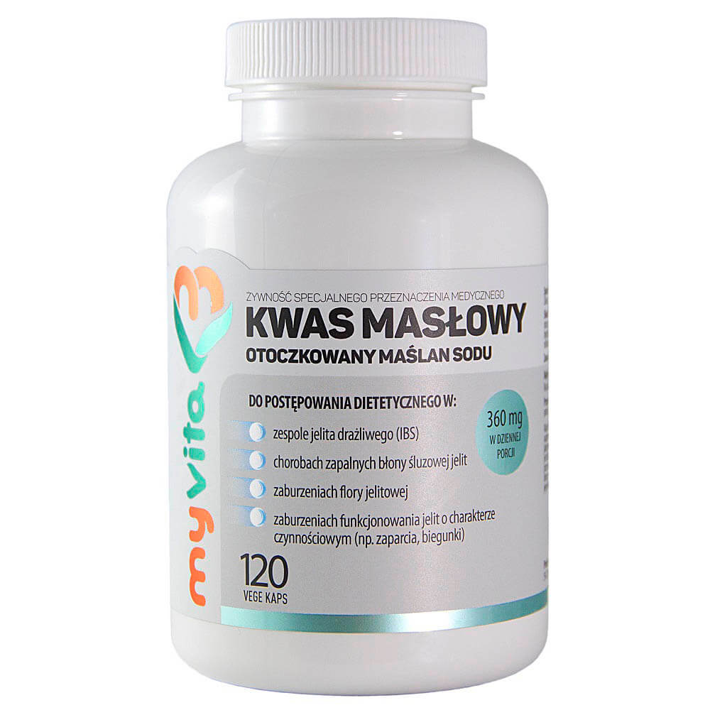 Buttersyre er en organisk forbindelse, der beskytter tarmen. Denne forbindelse, som er nødvendig for det problemfrie funktionsdygtige fordøjelsessystem, produceres i den indledende del af tyktarmen, men denne produktion er ikke tilstrækkelig til at dække det fulde behov, derfor er det nødvendigt at tilføre den med føde. MyVita® Buttersyre er fremstillet ved hjælp af den innovative mikrogranulation-teknologi, der muliggør en gradvis frigivelse af det aktive stof jævnt over hele tarmens længde. Dette forhindrer, at al syren kun forbruges i den indledende del af fordøjelsessystemet. Anvendelsen af en bekvem lipid-mikrohylster gør det lettere at sluge og neutraliserer ubehagelige smags- og lugtefornemmelser, der er forbundet med tilstedeværelsen af buttersyre.