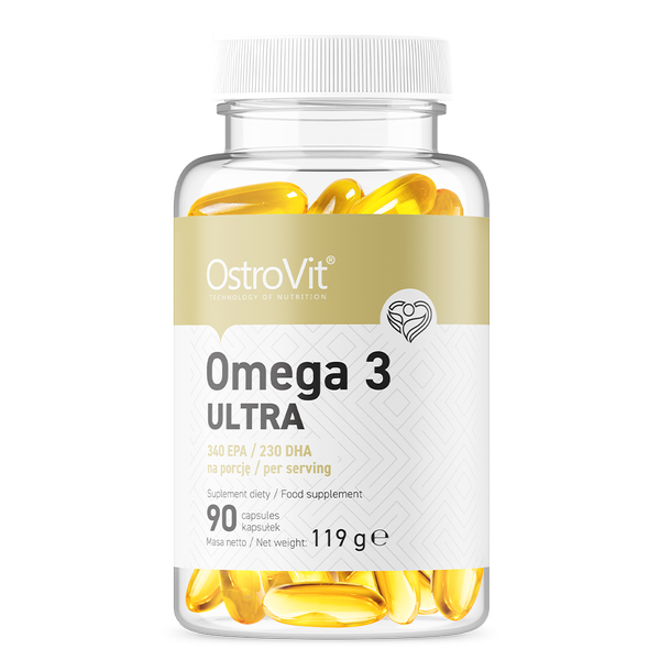 OstroVit Omega 3 Ultra 90 Kapseln एक उच्च गुणवत्ता वाला पोषण पूरक है, जो बहुअसंतृप्त ओमेगा-3 फैटी एसिड का स्रोत प्रदान करता है
