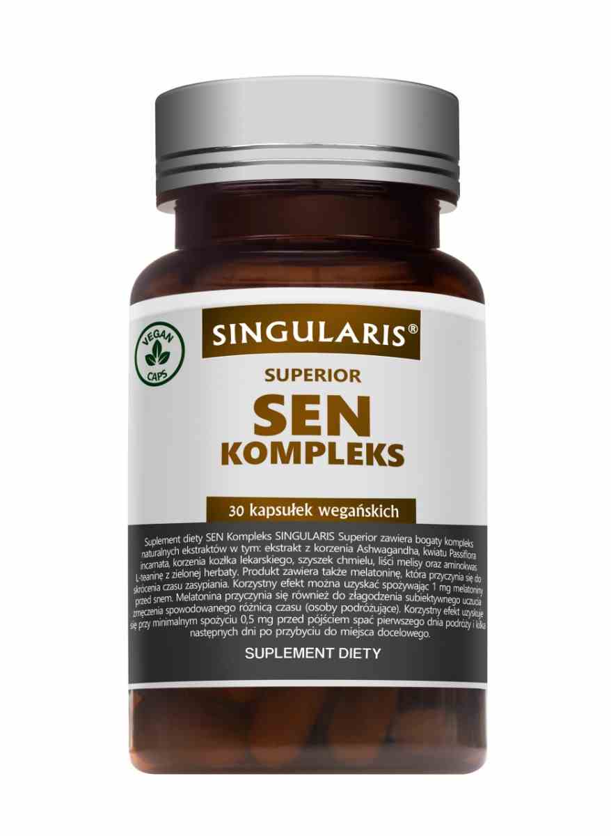 Thực phẩm bổ sung Singularis Sen kompleks là một sản phẩm độc đáo với sự kết hợp đặc biệt của các chiết xuất thực vật quý giá và các chất khác nhằm hỗ trợ giấc ngủ ngon và lành mạnh, đồng thời làm dịu và thư giãn cơ thể. Sản phẩm này bao gồm: chiết xuất rễ ashwagandha, chiết xuất hoa passiflora incarnata, L-theanine từ trà xanh, chiết xuất rễ cây nữ lang, chiết xuất nón hoa bia, chiết xuất lá melissa và melatonin. Nó có thành phần đơn giản, tự nhiên không chứa các chất phụ gia, chất tăng cường hoặc chất bảo quản không cần thiết hoặc nhân tạo. Sản phẩm được cung cấp dưới dạng viên nang thuần chay.
